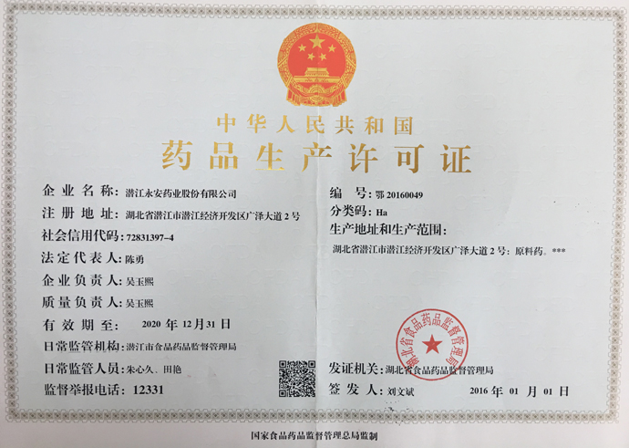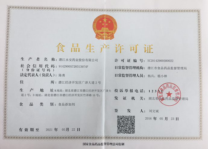 潛江永安藥業(yè)股份有限公司成立于2001年,坐落于江漢平原腹地潛江市國家高新技術(shù)產(chǎn)業(yè)開發(fā)區(qū),占地500余畝,注冊資金貳億玖仟肆佰陸拾捌萬貳仟伍佰元整,是一家擁有自主知識產(chǎn)權(quán)的國家高新技術(shù)企業(yè)。公司股票于2010年3 月5日在深圳證券交易所掛牌上市(股票代碼為002365)。公司具有雄厚的技術(shù)開發(fā)能力,是湖北省創(chuàng)新型企業(yè)和湖北省知識產(chǎn)權(quán)建設(shè)示范企業(yè)。公司研發(fā)平臺分別被認定為省級企業(yè)技術(shù)中心和湖北省功能性食品添加劑工程技術(shù)研究中心。 經(jīng)過多年的發(fā)展,公司形成了以食品及藥品添加劑牛磺